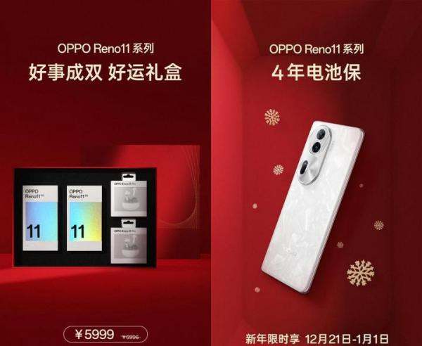 OPPO在年末大促中,Reno11标准版直降200元,8+256GB版本到手只需2299元起,性价比极高。此外,OPPO还推出了好事成双限定礼盒,包含两台Reno11标准版和两款Enco R Pro耳机,并且手机享受4年电池保服务,非常适合自用或送礼。