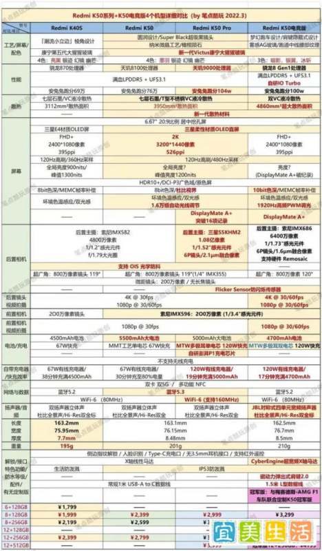 极致性能选K50 Pro(天玑9000);均衡性价比选K50(天玑8100);轻度使用选K40s(骁龙870);电竞专属选K50电竞版(骁龙8 Gen1+游戏优化)。2. 屏幕素质对比K50 Pro/K50: