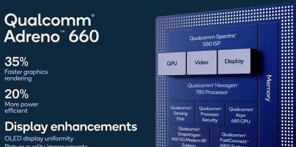 GPU为Adreno 660,图形渲染速度提升35%,能效提升20%。