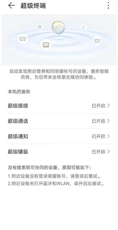 超级续接:支持与附近设备接续使用应用,手机、平板、电脑和智慧屏可与本机互相接续应用的内容和使用状态。