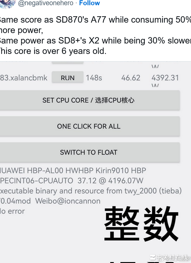 以下是@negativeonehero针对麒麟9010开展的AndSPECMod基准测试结果:其单个性能核心的功耗水平与高通骁龙8+ Gen1所搭载的Cortex-X2核心相当,但实际运行速度明显偏低。该测试直观反映出,在相近功耗约束下,麒麟9010的性能核心执行效率尚有提升空间。