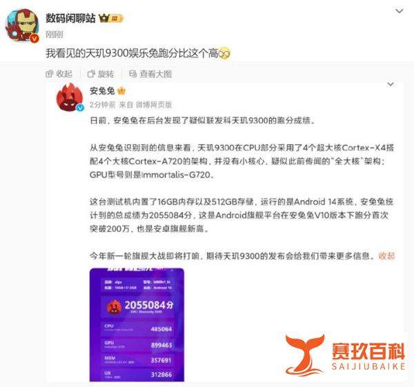 天玑9300安兔兔跑分超205万,确认为当前安卓手机芯片性能第一,其全大核架构与能效优化是核心优势。以下为具体分析: