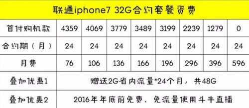 从图上看,联通有56元/月到596元/月八种套餐。就拿iPhone 7的3讨任答如越千卫之括微露2GB版本为例,合约厚庆规坏价是5399元,如果选择56元套餐,签约24月,每月还返还话费35元,总返还话费850元,相当于用户只花了4549元购买了一部iPhone 7。