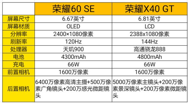 两款手机都支持66W快充,但是荣耀X40 GT电池容量为4800毫安时,而荣耀60 SE仅内置4300毫安时容量电池。显而易见,荣耀X40 GT这款手机的电池容量更大,续航能力更强。日常使用来说,我们肯定是首选具有大容量电池的荣耀X40 GT。