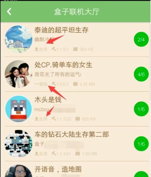 2、然后,进入联机大厅可以看到很多人开的房间,有玩冒险模式的,有玩生存模式的,如下图所示。