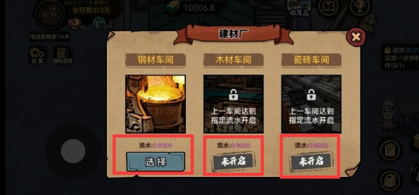 进入建材厂后,我们能够发现这里有三个车间。要使建材厂顺利竣工,我们必须确保每个车间的流水达到8000。这个目标需要我们合理分配资源,提升工作效率。随着时间的推移,通过有效的管理和运营,我们逐步提升每个车间的生产效率,最终实现流水达到8000的目标。