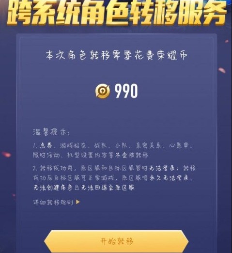 5、点击角色工具开始转移(在该界面可以看到转移账号需要花费990荣耀币,也就是99人民币)