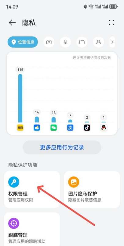 进入隐私设置页面,点击【权限管理】权限管理是集中管理应用权限的地方,通过此步骤可对各应用的权限进行详细设置。