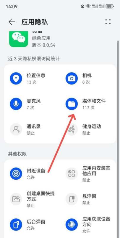 进入微信应用权限设置页面,点击开启【媒体和文件权限】开启该权限后,微信就能够正常访问手机相册,实现图片的发送、保存等操作。