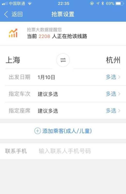 填写车票信息选择起点和终点、出发时间、车次、座位类别以及乘客信息。每个选项均可多选备用,以增大抢票成功概率。完成后进入下一步。