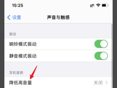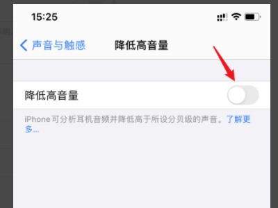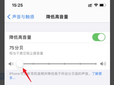 5、打开后,在下方设置对应的分贝级别,设置后耳机的音频声音就不会高于该分贝,airpods声音就会变小了,如下图所示。