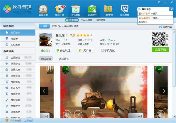 3,然后打开电脑管家——软件管理——安卓游戏——右上角搜索【暴风炮手】即可找到这款游戏的下载资源,游戏简介,以及游戏截图。
