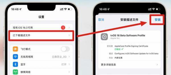 前往系统设置,会看到页面显示“已下载描述文件”。点开该描述文件并进行安装。如果没有自动显示,可以进入“设置”-“通用”-“设备管理”,找到名为tvOS的描述文件并选择安装。安装过程中会要求输入锁屏密码,按照提示输入即可。安装完成后,重启iPhone。