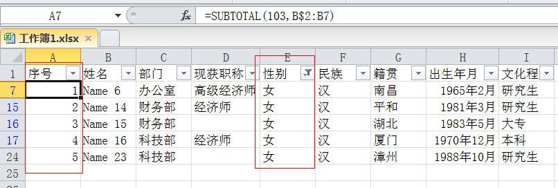 公式下拉复制,下面进行自动筛选性别为“女”的看看结果,如下图,编号是从1开始的连续的自然数。