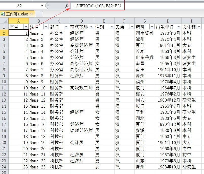 使用分类汇总函数SUBTOTAL函数进行编号。